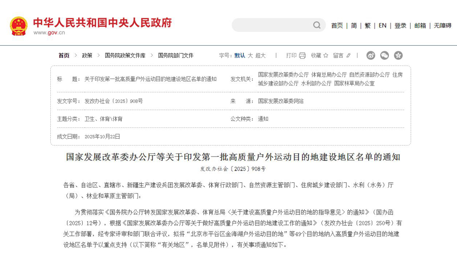 近日,国家发展改革委、体育总局等六部委联合印发通知,公布第一批高质量户外运动目的地建设地区名单。