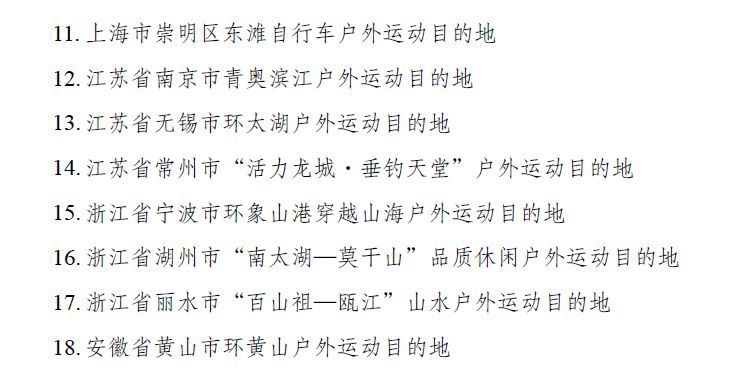 其中,长三角地区入选的有:上海市崇明区东滩自行车户外运动目的地、江苏省南京市青奥滨江户外运动目的地、江苏省无锡市环太湖户外运动目的地、江苏省常州市“活力龙城·垂钓天堂”户外运动目的地、浙江省宁波市环象山港穿越山海户外运动目的地、浙江省湖州市“南太湖—莫干山”品质休闲户外运动目的地、浙江省丽水市“百山祖—瓯江”山水户外运动目的地、安徽省黄山市环黄山户外运动目的地等八地。